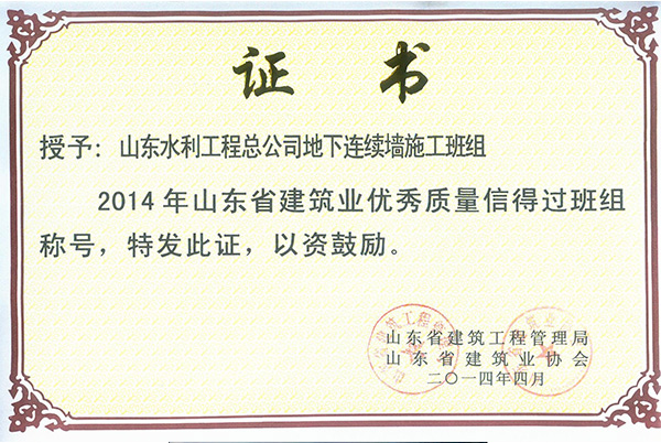 公司“地下連續(xù)墻施工班組”榮獲2014年山東省建筑業(yè)優(yōu)秀質(zhì)量信得過(guò)班組稱(chēng)號(hào)