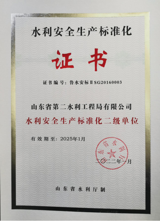 二局有限公司于近日順利通過了山東省水利廳水利安全標(biāo)準(zhǔn)化二級達(dá)標(biāo)企業(yè)延期換證。
