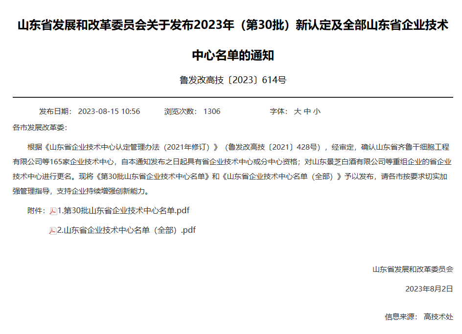 8月15日,山東省發展和改革委員會發布2023年山東省企業技術中心名單,公司憑借自身綜合創新能力成功入選,獲評山東省企業技術中心稱號。