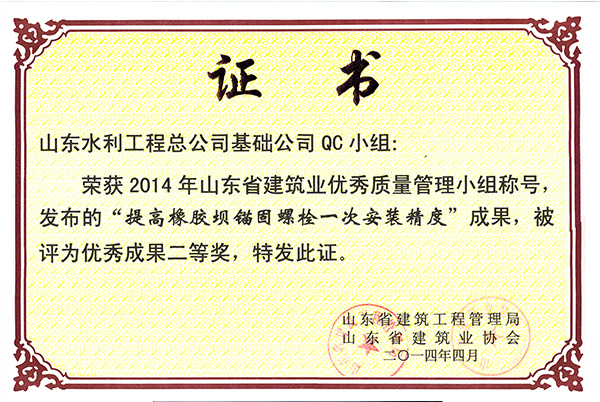 公司“提高橡膠壩錨固螺栓一次安裝精度”榮獲2014年山東省建筑業優秀質量管理優秀成果二等獎
