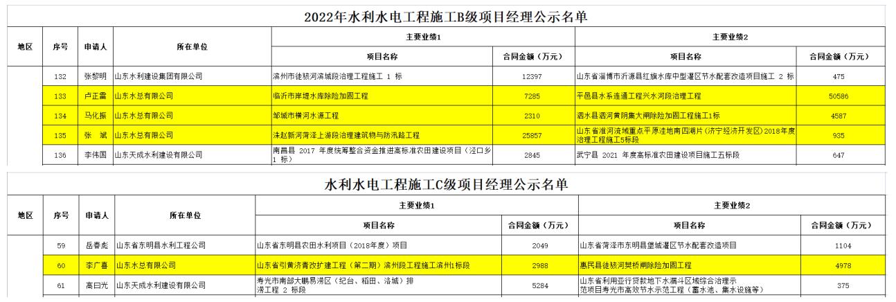 近日,中國水利企業協會發布《2022年水利水電工程施工項目經理評價等級公示》,我公司盧正雷、馬化振、張斌三名同志被評為“2022年水利水電工程施工B級項目經理”,李廣喜被評為“2022年水利水電工程施工C級項目經理”。