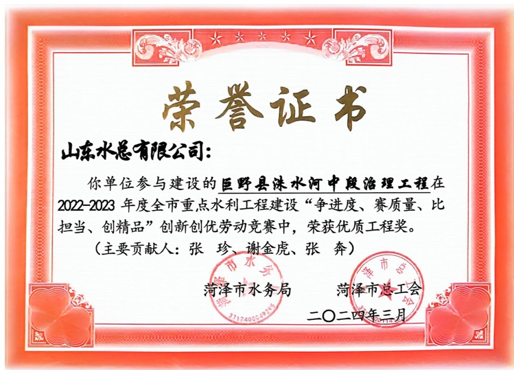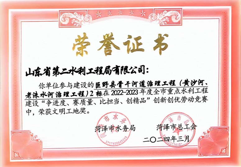 近日,菏澤市水務局、菏澤市總工會公布了“2022-2023年度全市重點水利工程建設“爭進度、賽質量、比擔當、創精品”創新創優勞動競賽”獲獎名單,公司及權屬單位二局有限公司共榮獲優質工程1項、文明工地2項、QC成果1項,優秀項目經理1項。