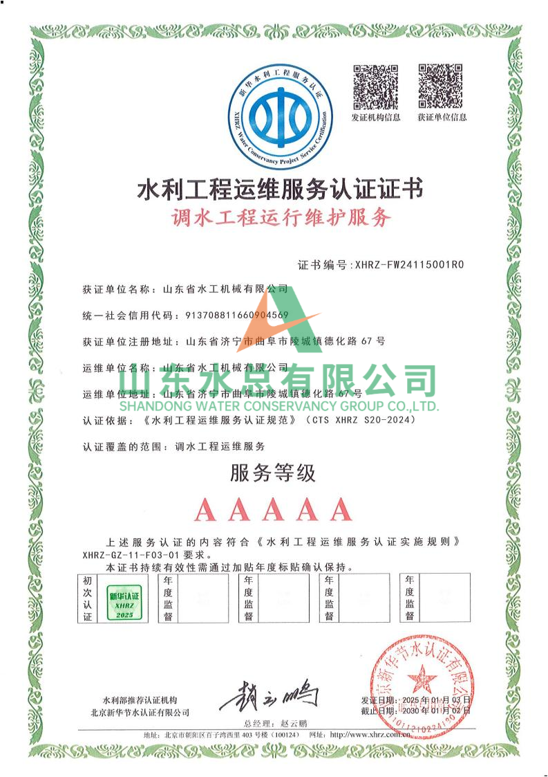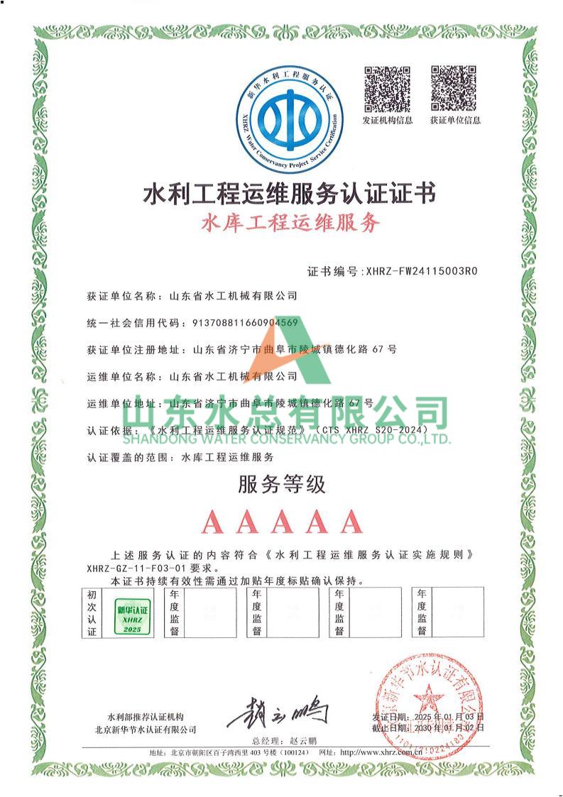 一直以來,水工機械公司高度重視水利工程運維服務的質量與專業性,在人員配備、技術應用、管理體系等多方面精心打磨。在認證過程中,歷經嚴格審核,公司憑借扎實的運維實力、規范的服務流程以及對水利工程運維高規格的執行標準,贏得了認可。