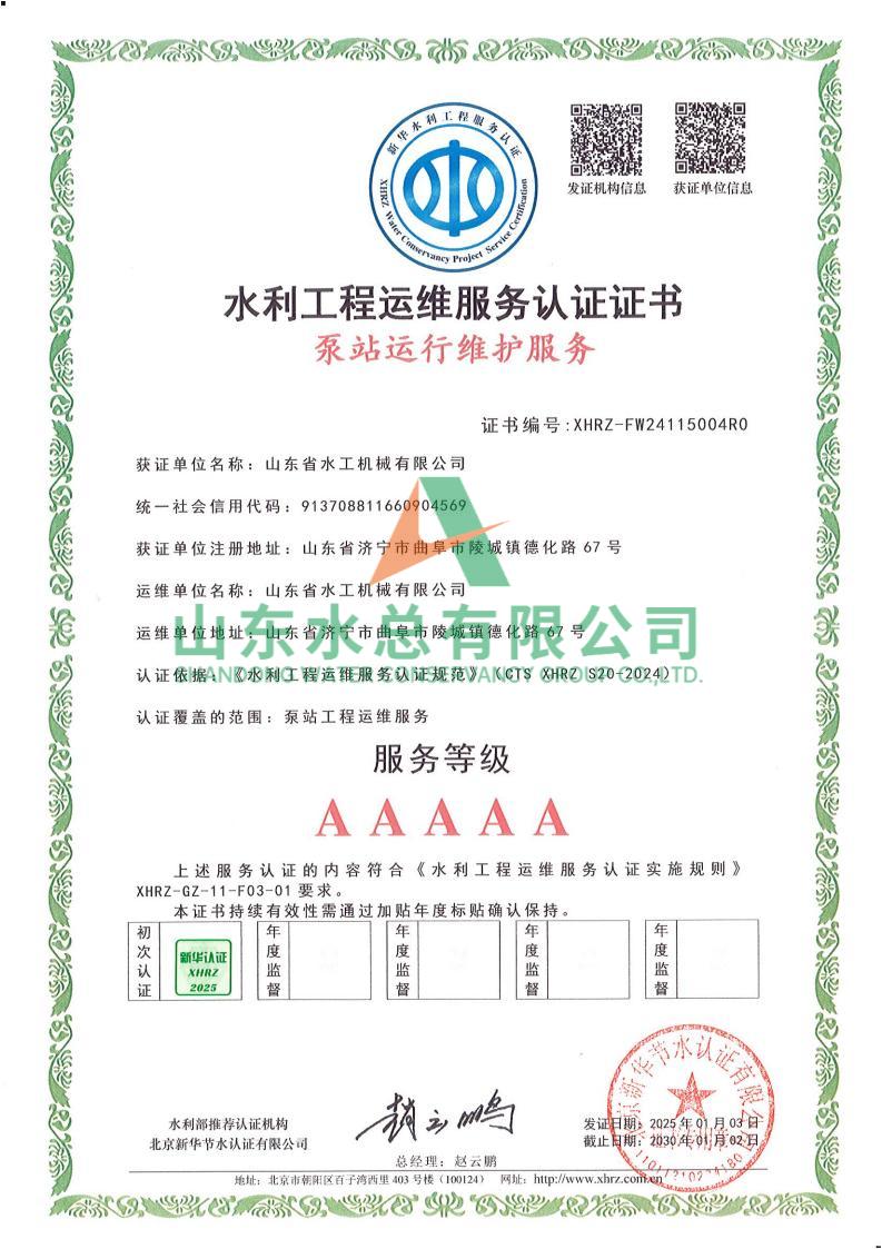 近日,水工機械公司順利通過北京新華節水認證公司認證程序,公司水利工程運行維護服務調水工程、水閘工程、水庫工程及泵站工程4個類別達成5A(最高)等級認證。新華節水是由中國水利部綜合事業局發起,經水利部推薦,并由國家認證認可監督管理委員會批準的第三方認證機構,是與中國節能產品認證、中國質量認證并列的權威節水認證機構。