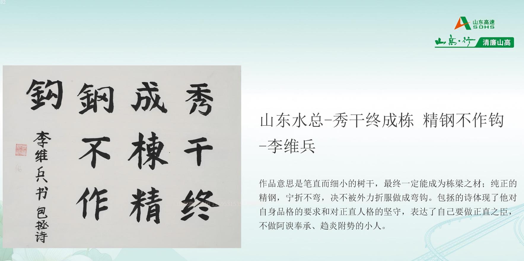 6月11日,在山東高速集團紀委組織的“清廉山高”廉潔文化作品征集活動中,山東水總基礎工程有限公司制作的短視頻《筑廉潔防線,守初心之路》榮獲“光影映廉”板塊三等獎,第二分公司李維兵的書法作品《秀干終成棟,精鋼不作鉤》摘得“工藝創廉”書法類優秀獎。