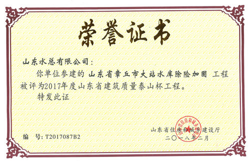 公司“山東省章丘市大站水庫除險加固工程”榮獲2017年度山東省建筑質量泰山杯