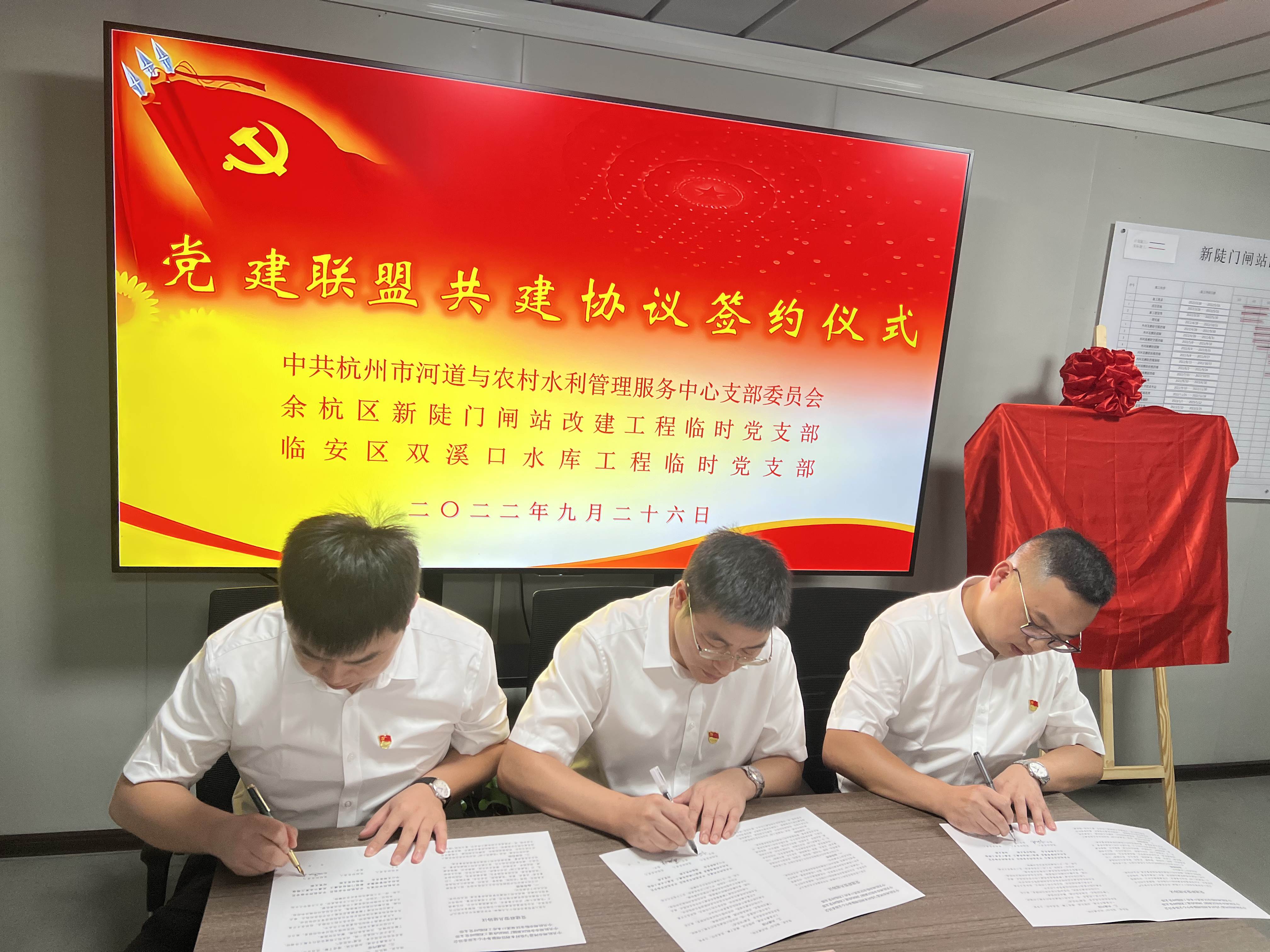 9月26日,中共杭州市河道與農(nóng)村水利管理服務(wù)中心支部委員會、中共杭州市余杭區(qū)新陡門閘站改建工程臨時黨支部、中共杭州市臨安區(qū)雙溪口水庫工程臨時黨支部在新陡門閘站改建工程現(xiàn)場舉行黨建聯(lián)建協(xié)議簽約儀式。市農(nóng)水中心支部書記、主任葉利偉,余杭區(qū)林水局黨委委員、二級調(diào)研員徐偉林,臨安水利局機關(guān)黨委副書記、紀(jì)檢書記劉勇,新陡門閘站改建工程臨時黨支部書記葛旭峰,雙溪口水庫工程臨時黨支部書記孟天琦及各支部代表參加簽約活動。