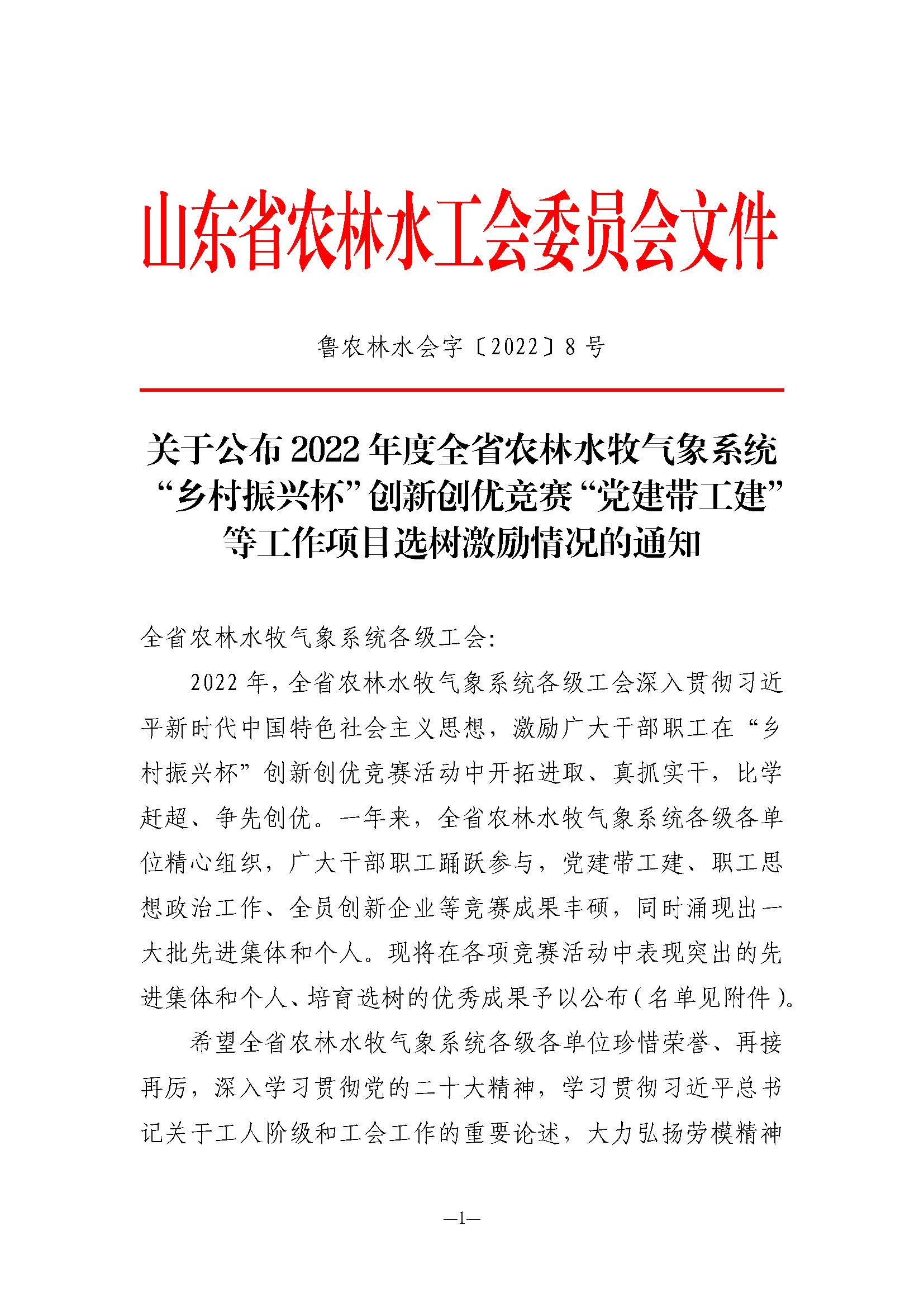 近日,山東省農林水工會委員會下發《關于公布2022年度全省農林水牧氣象系統“鄉村振興杯”創新創優競賽等工作項目選樹激勵情況的通知》,對涌現出的先進集體、個人和優秀案例予以通報表揚。第六分公司報送的《以“黨建+”系列活動為抓手 實施“黨建帶工建項目化”管理》和基礎公司報送的《黨建帶工建 攜手共建》兩個案例榮獲“黨建帶工建、工建促黨建”優秀案例;第二分公司報送的《堅持以人為本 結合實際開展職工思想政治工作》榮獲“職工思想政治工作”優秀案例;劉永恩同志榮獲第二屆“身邊的愛崗敬業榜樣”;蘇強、謝金虎、李云賀同志榮獲“職工安全隱患排查競賽優秀個人”。